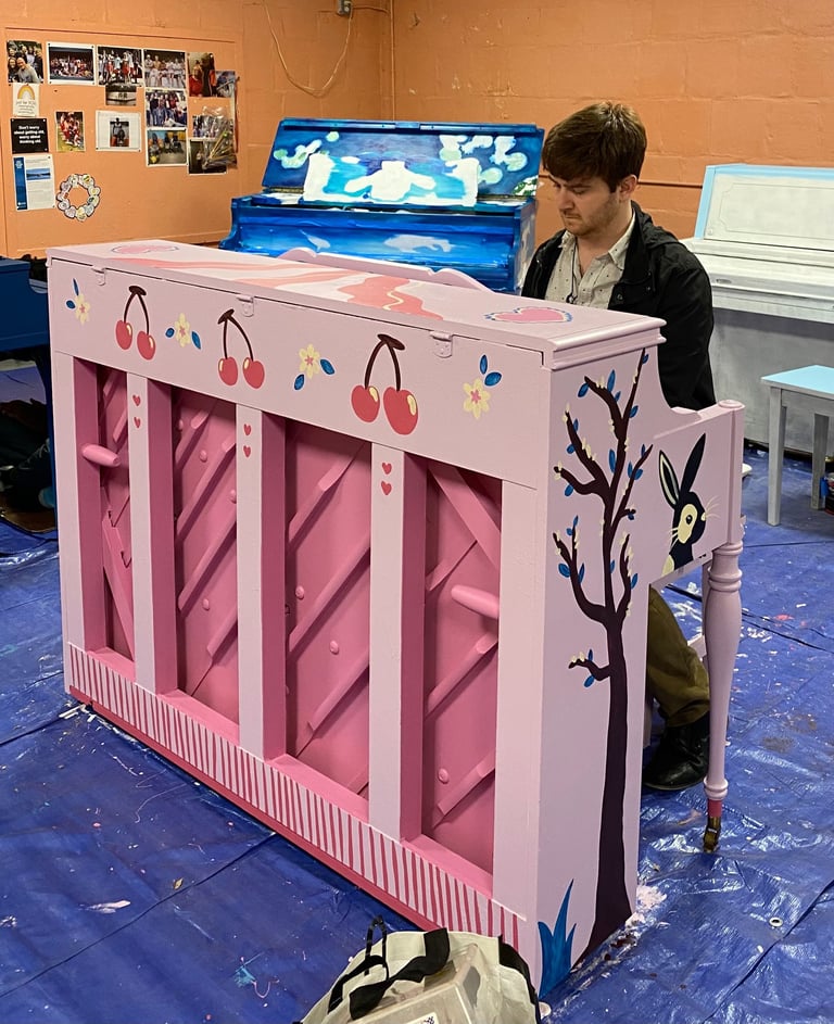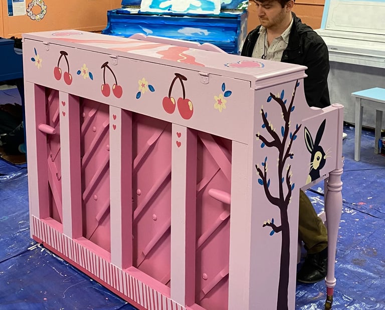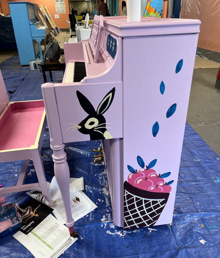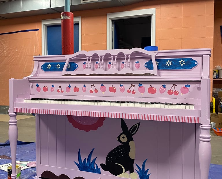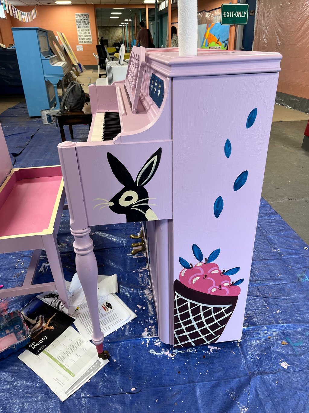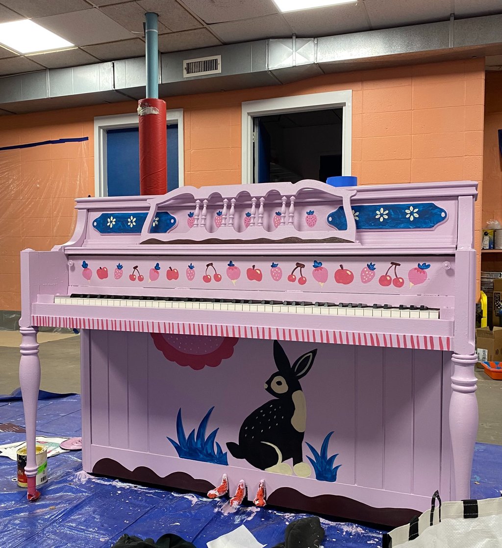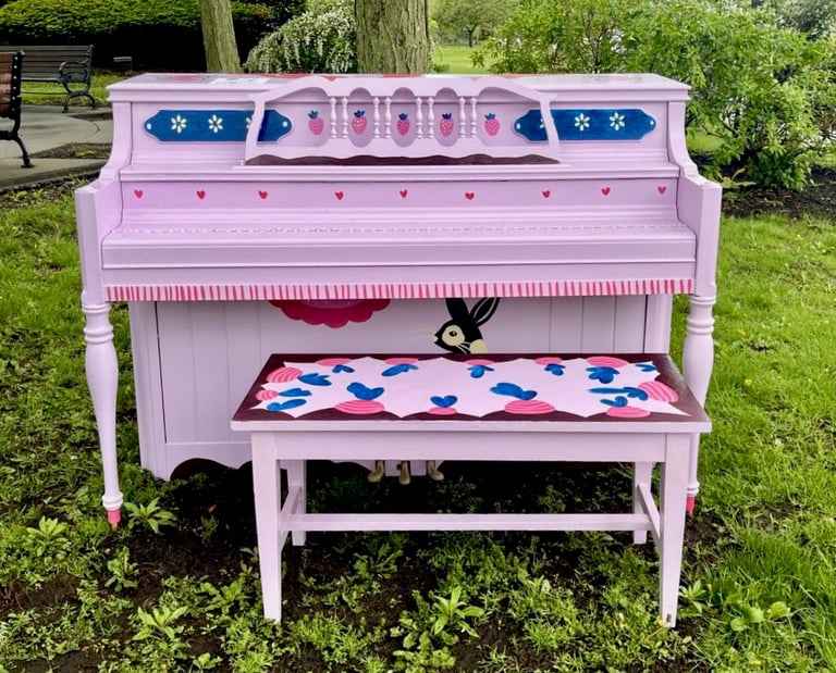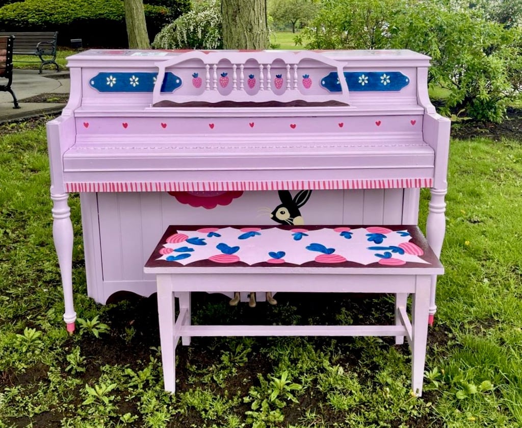The Harvest Commissioned by the Town of Newton, this playable piano is painted in a variety of bunnies harvesting local fruits and vegetables. This piano is meant as a whimsical element you'll find in Newton during the summer that can brighten up any day with it's visual and it's tune. Summer location is in front of the Auburndale.