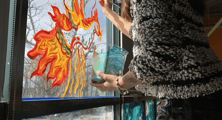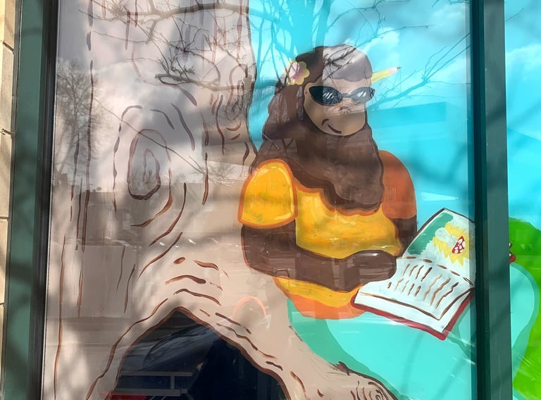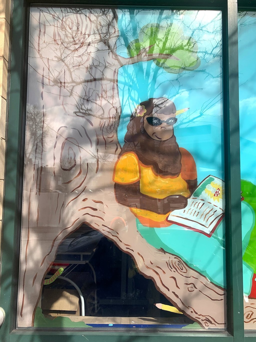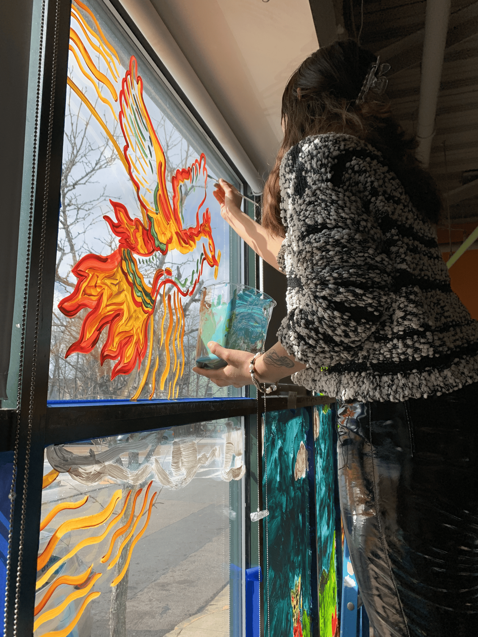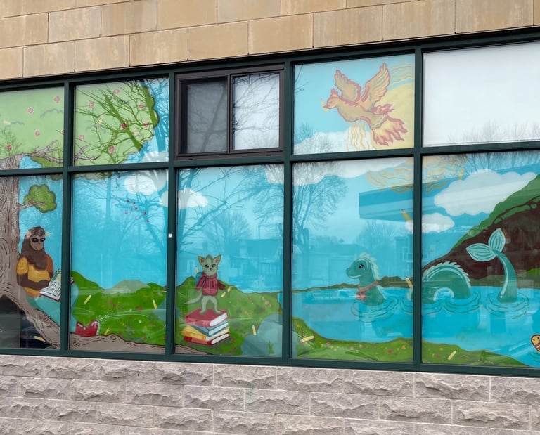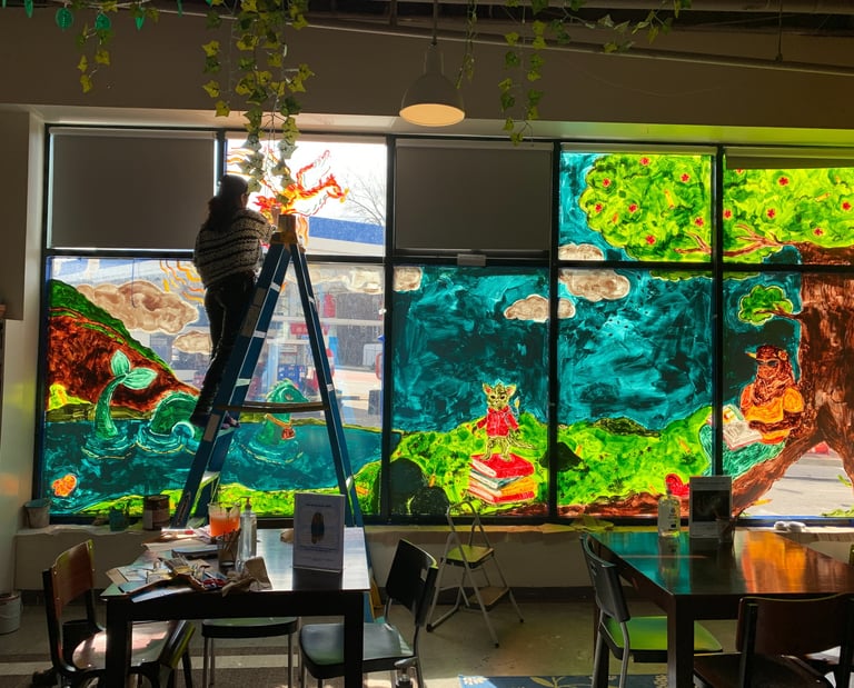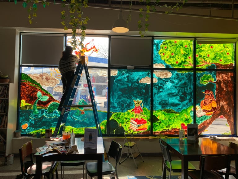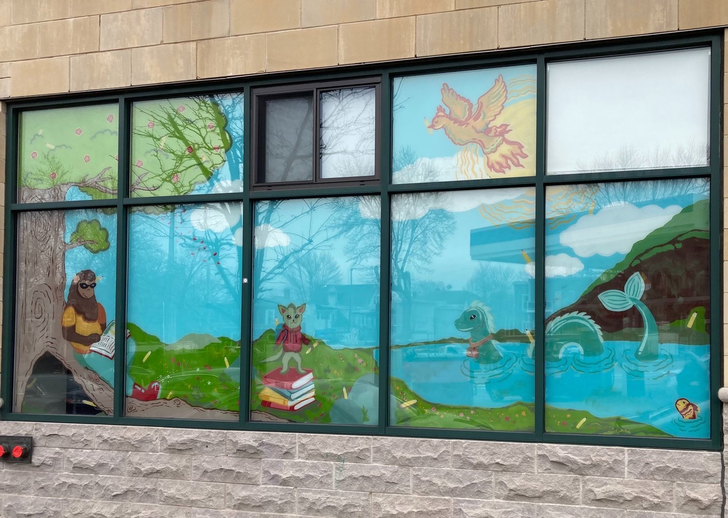 Painted and designed 5 window mural for 826 Boston’s tutoring center.