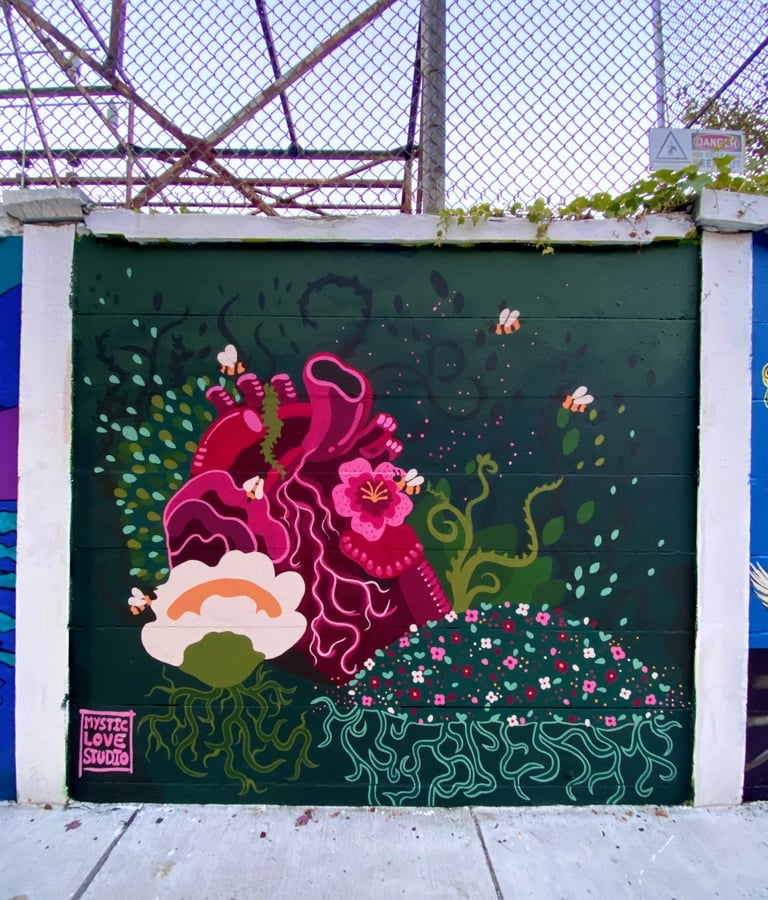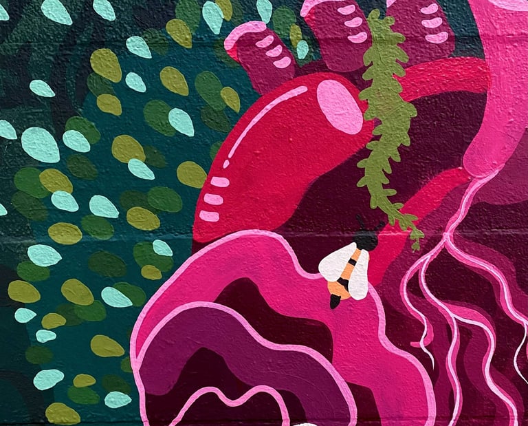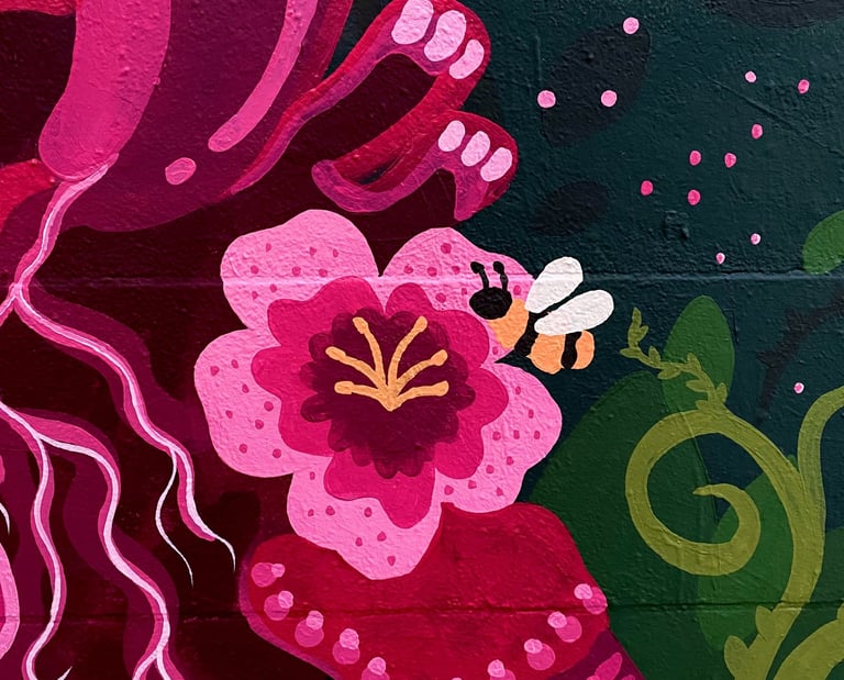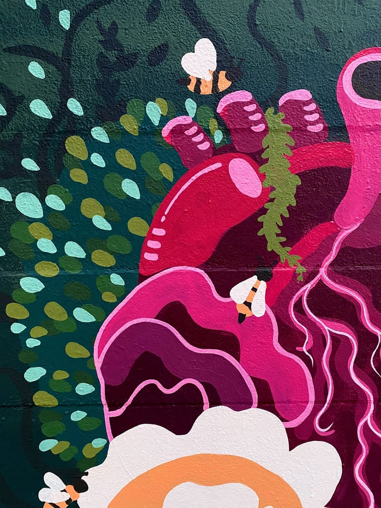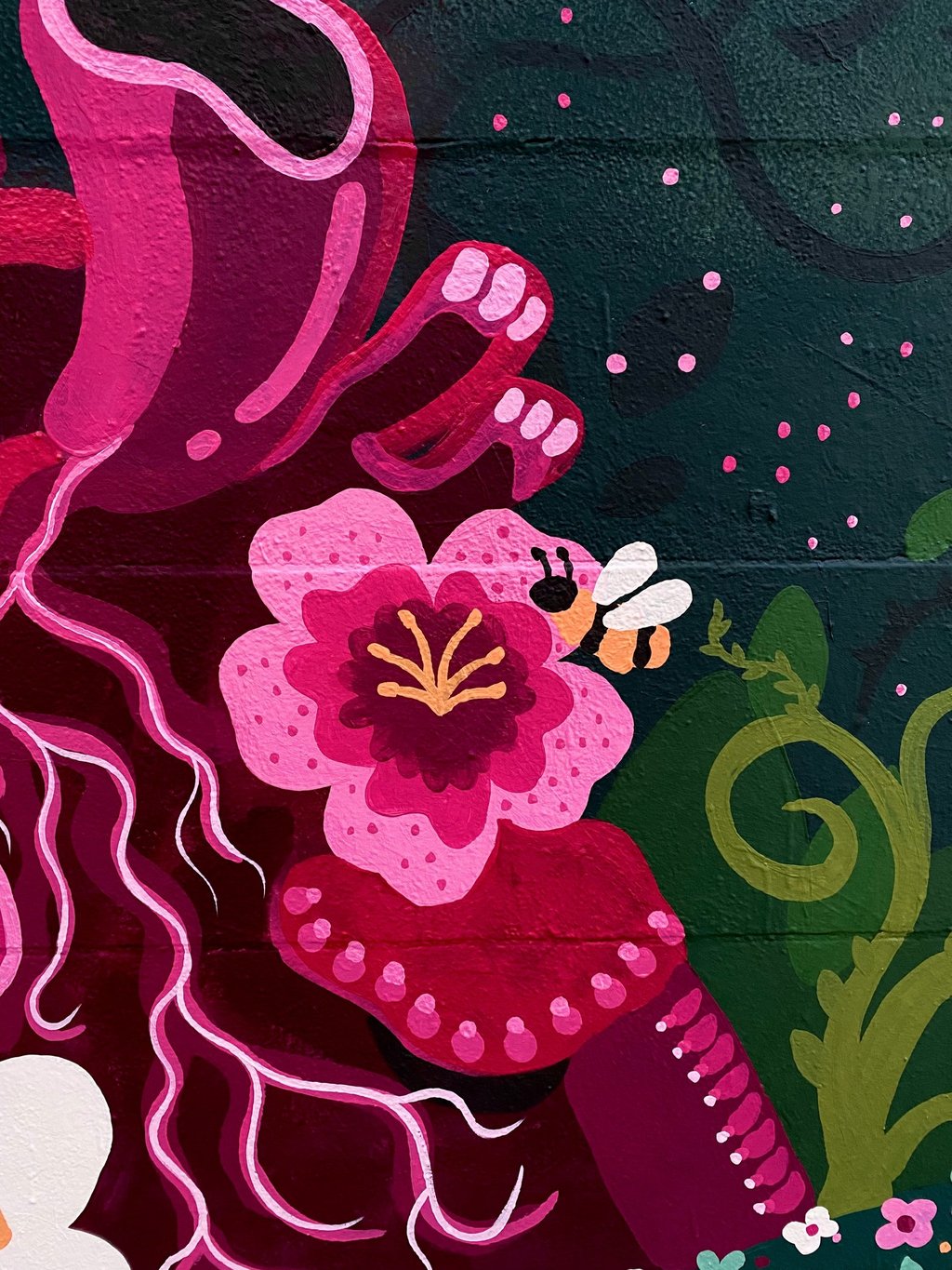 Pollination is an 8x8' mural created as part of the Punto Urban Art Museum Raices/ Roots mural project. The project consists of 10 walls painted by various artists with Roots as a theme. Pollination is about cultivating roots from each other and blooming together. Empathy and compassion allows us to do this and continue expanding our roots as a collective that wants each other to succeed.