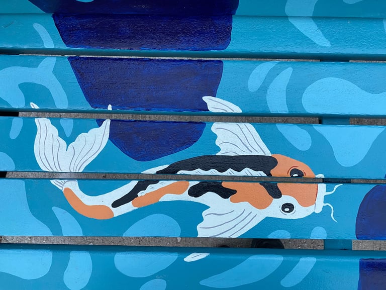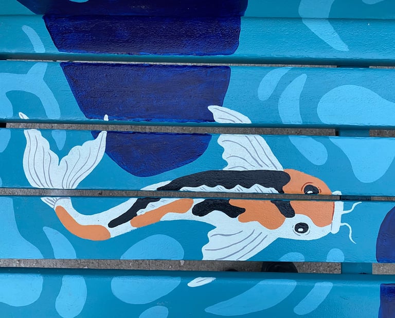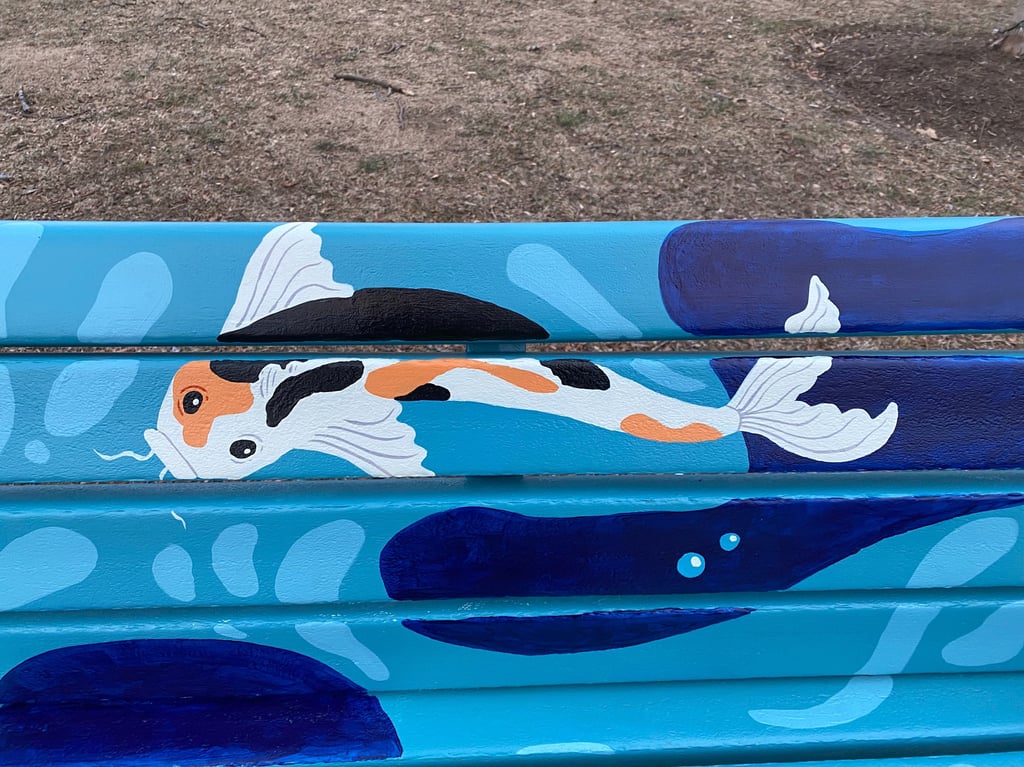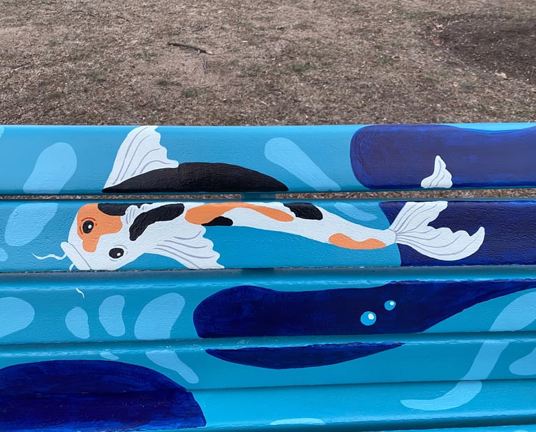 Commissioned by the Town of Brookline, these are two benches which are painted the same way. The work is called Serenity Seat and currently resides in front of the Brookline Town Hall. Serenity Seat is an invitation for the viewer to take a breathe and relax in these zen benches.