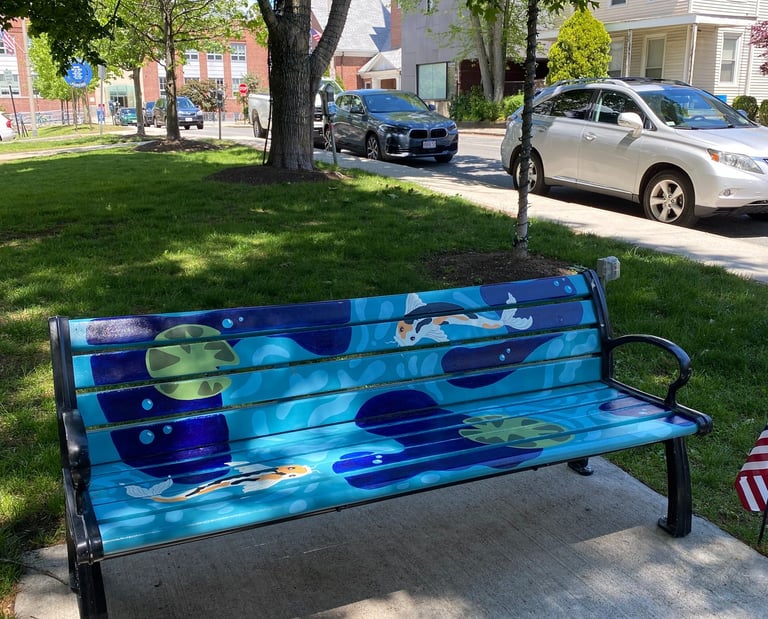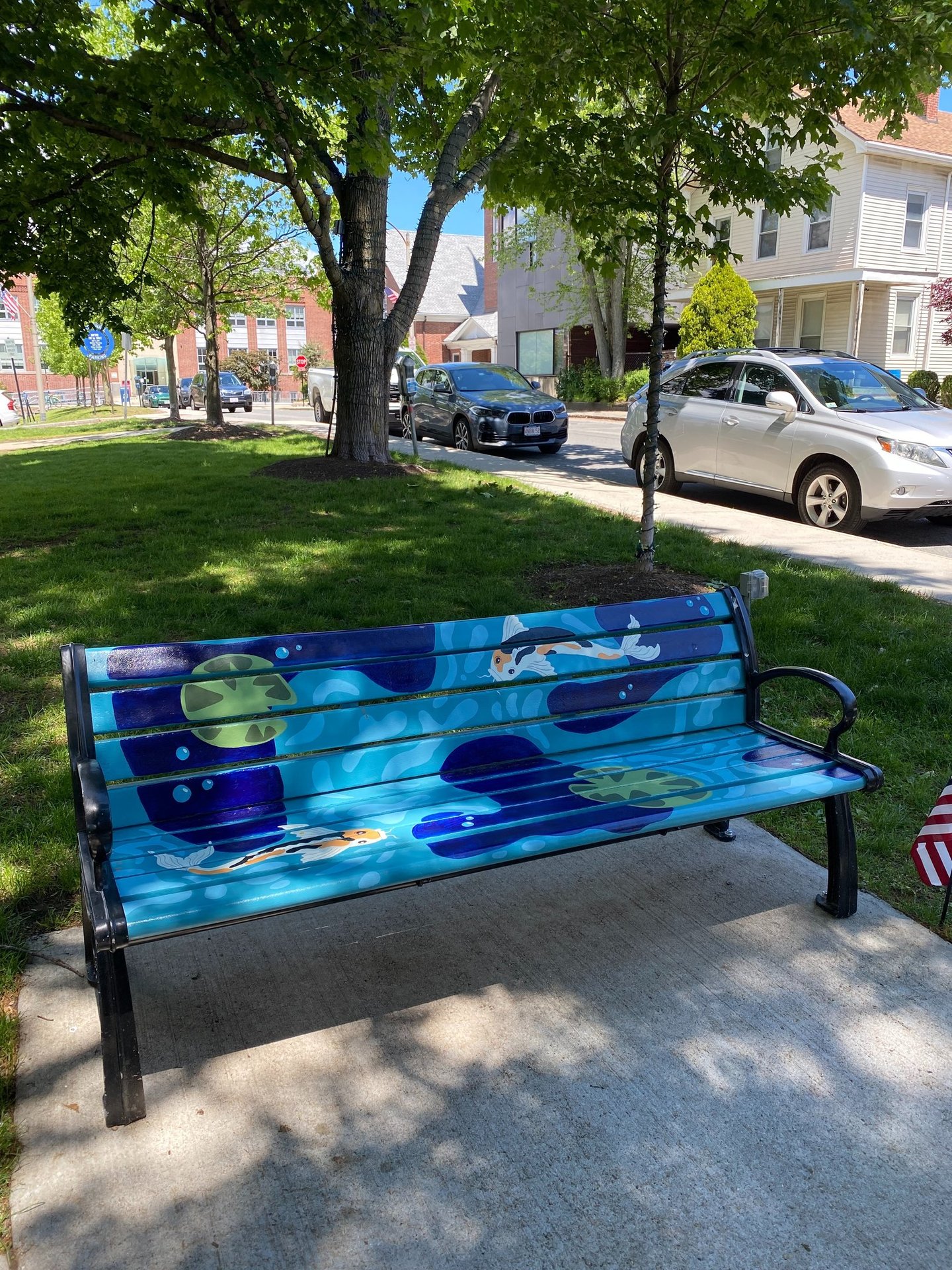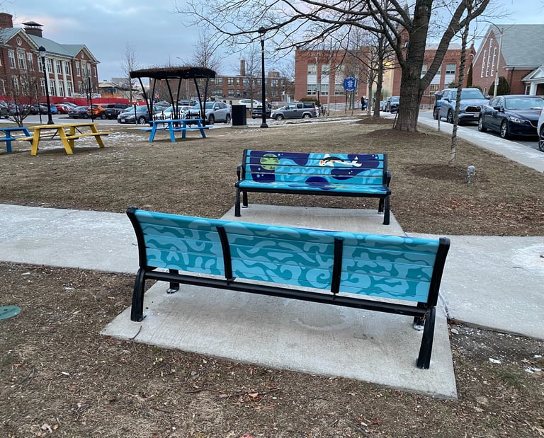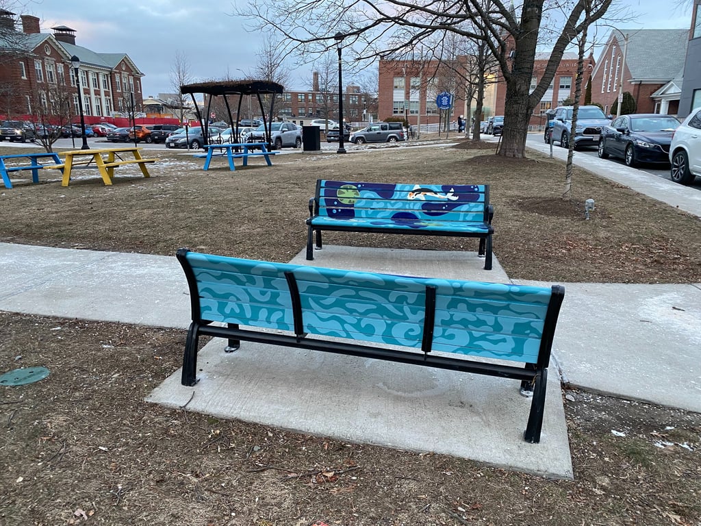 Two benches painted and designed to be displayed at the front yard of Brookline Town Hall in Brookline Village.