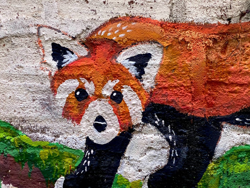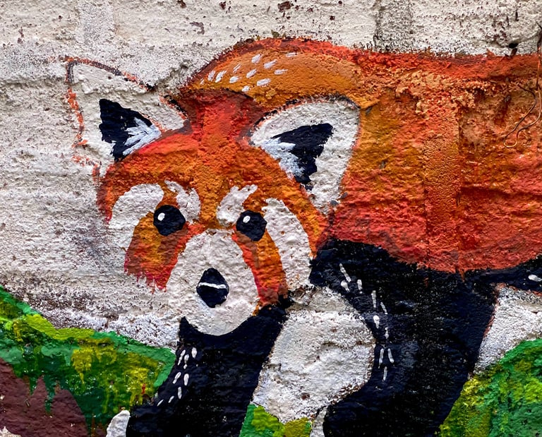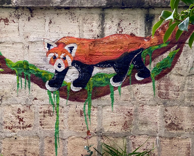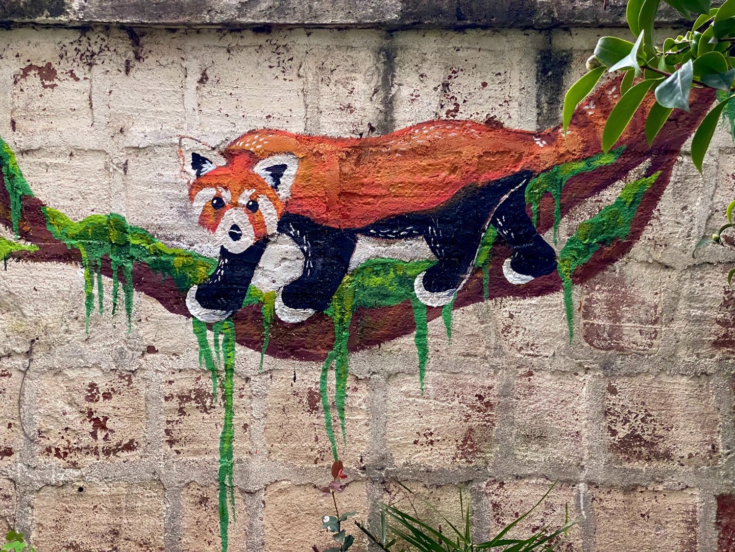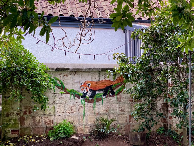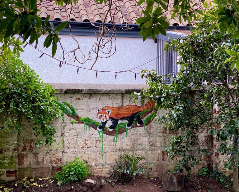 This mural was made for a client that specifically wanted to have a simple animal incorporated within their garden. The empty wall did not represent the liveliness of the garden so the red panda was chosen to bring good luck and color.