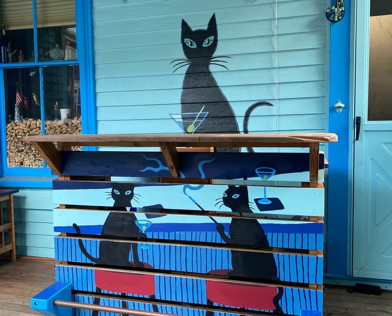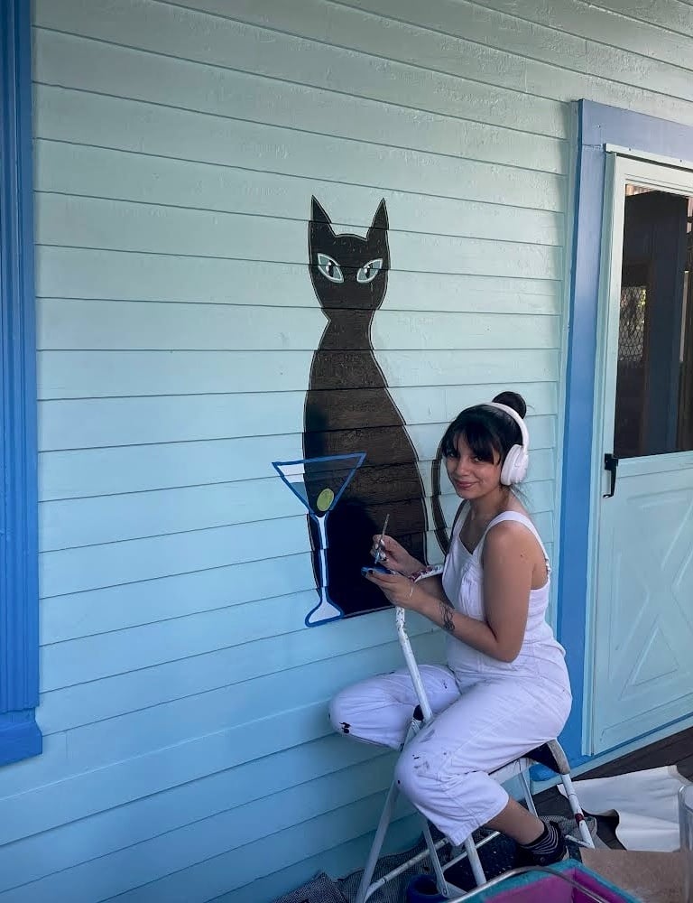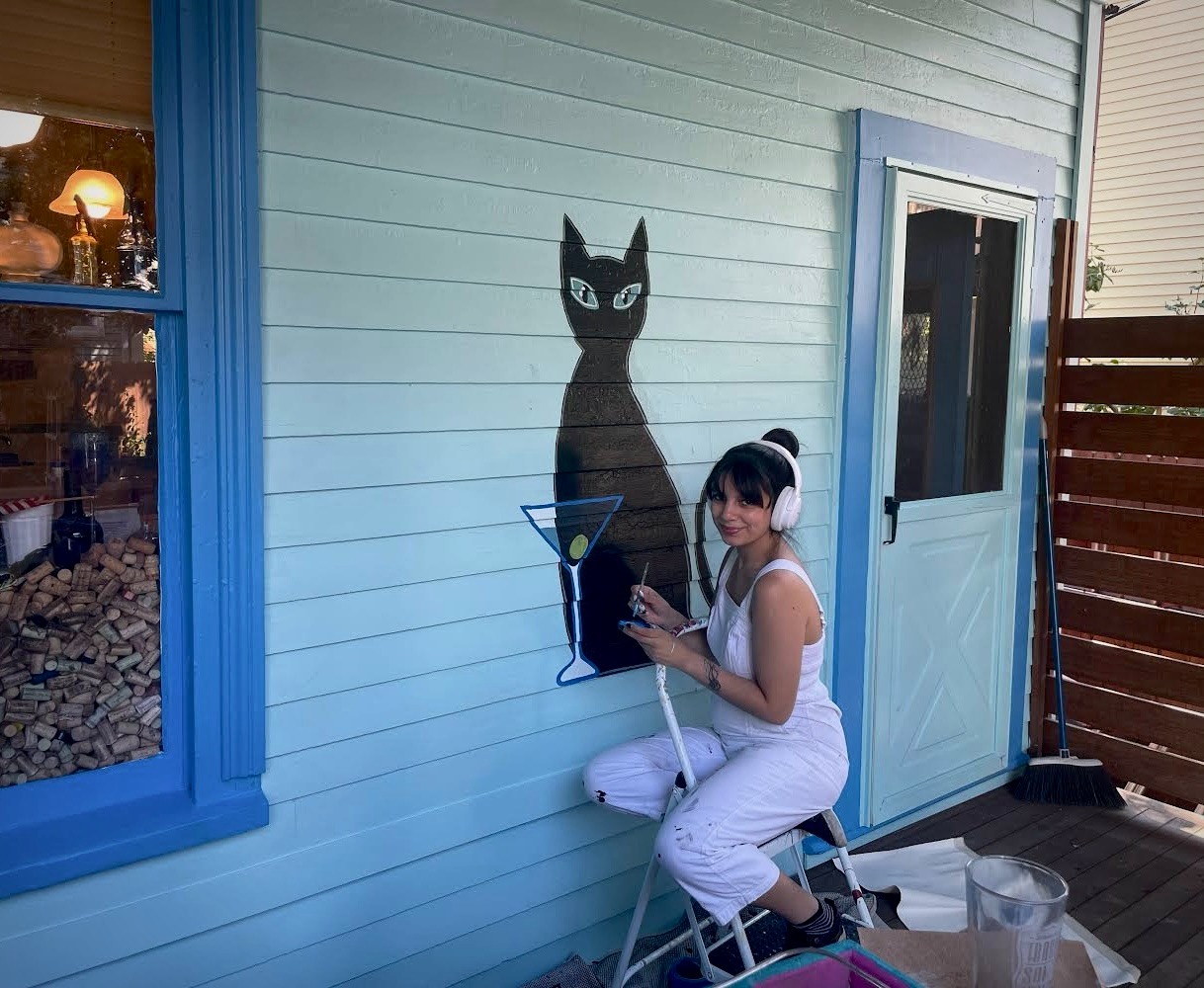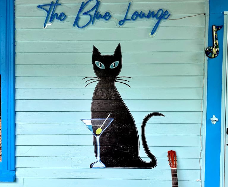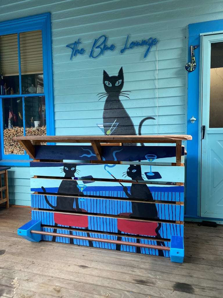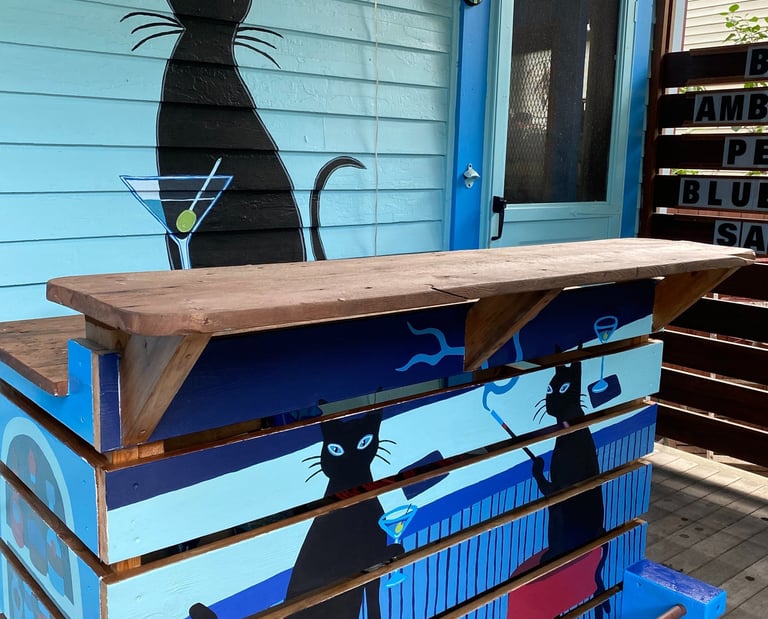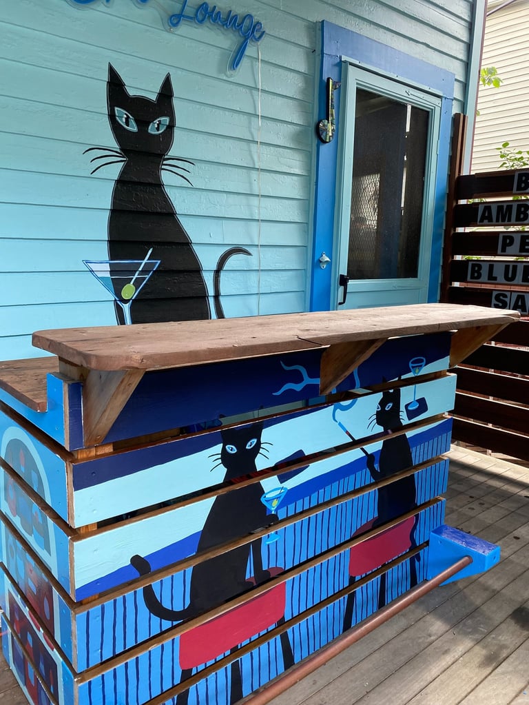 Midnight Lounge is a commission from a private client, the invite-only club The Blue Lounge. There are two murals featured. The first is a black cat with a martini in the back wall where musicians perform. The second is the bar for the lounge which features a selection of bottles on the side as well as two cats lounging in a bar with martinis and a cigarette on the front.