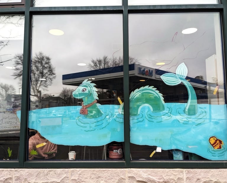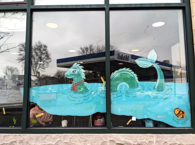 826 Boston is a non-profit that encourages and facilitates kids in Boston to write, read and learn. They tutor for free and publish their own books with student writers. The window mural, which is in the tutoring center, depicts various cryptids including Bigfoot, the Chupacabra and Thunderbird, having a field trip. There are over a dozen hidden pencils in this mural!